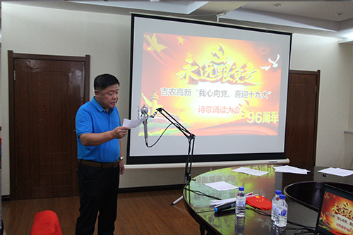 為慶祝建黨96周年,迎接中國共產(chǎn)黨的第十九次代表大會勝利召開,培養(yǎng)干部、職工愛黨、敬業(yè)、精誠團結(jié)和務(wù)實創(chuàng)新精神,在吉農(nóng)高新公司黨委和玉米所黨支部的高度重視與大力支持下,由吉農(nóng)高新工會和玉米所分工會聯(lián)合組織,于2017年7月20日下午,以“我心永向黨,喜迎十九大”為主題的職工朗誦會活動,在公主嶺院區(qū)主樓大會議室如期舉行。公司黨委副書記張秀文、玉米所黨支部書記黃威及公司高管、各分工會負責(zé)人代表,共有15個單位,近60 名同志出席本次活動。