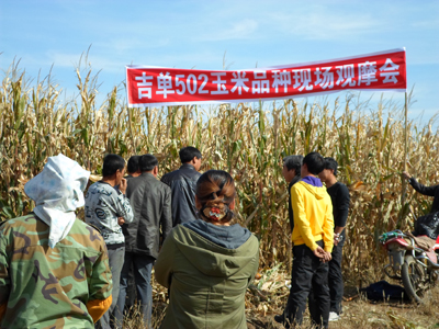 2012年9月20日——2012年10月15日,公司在內(nèi)蒙古自治區(qū),興安盟、通遼、達(dá)拉特旗、突泉、呼和浩特等地,依托經(jīng)銷商以村屯為單位,少則十幾人、多則數(shù)百人,分別召開了吉單27、吉單502、吉單505等品種的現(xiàn)場會。在達(dá)拉特旗昭君鎮(zhèn)城拐村,農(nóng)民和經(jīng)銷商參觀了付性農(nóng)戶12畝地的吉單502生產(chǎn)田,其種植密度達(dá)到每畝4600株,當(dāng)場估產(chǎn)達(dá)到每畝2000市斤以上。周圍的農(nóng)戶都表示實(shí)際看到心里有了底,來年一定多種植吉單502。